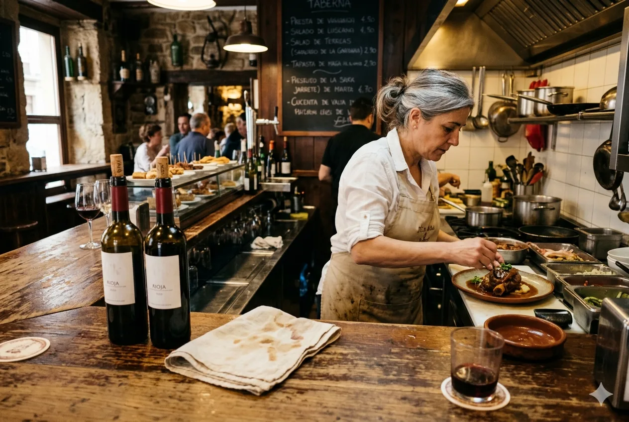 Marta abrió en marzo de 2014 tras veinte años cocinando junto a su madre en el restaurante familiar. Cuando aquello cerró, buscó un local pequeño en el Casco Antiguo, a 200 metros del Mercado de Abastos. Carta corta, producto de temporada, vinos de Rioja honestos. Sin florituras. Si algo no está en temporada, no está en la carta.
